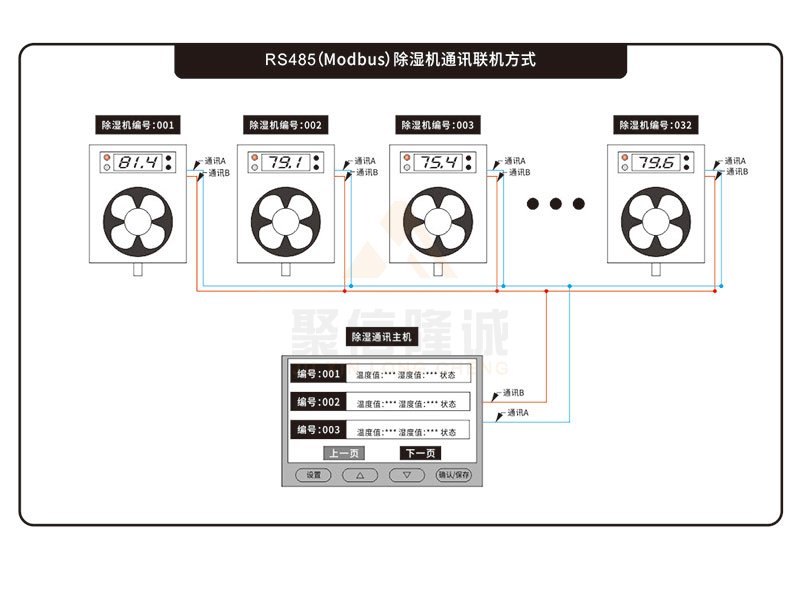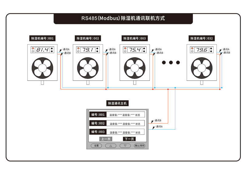 係統主要由:一台主機和若幹台(1~32台)抽濕器子機構成;抽濕器子機主要負責數據采集、環境控製和數據上傳;主機主要負責:數據分析、數據保存和相關參數設置。主機與抽濕器子機之間采用485通訊連接。